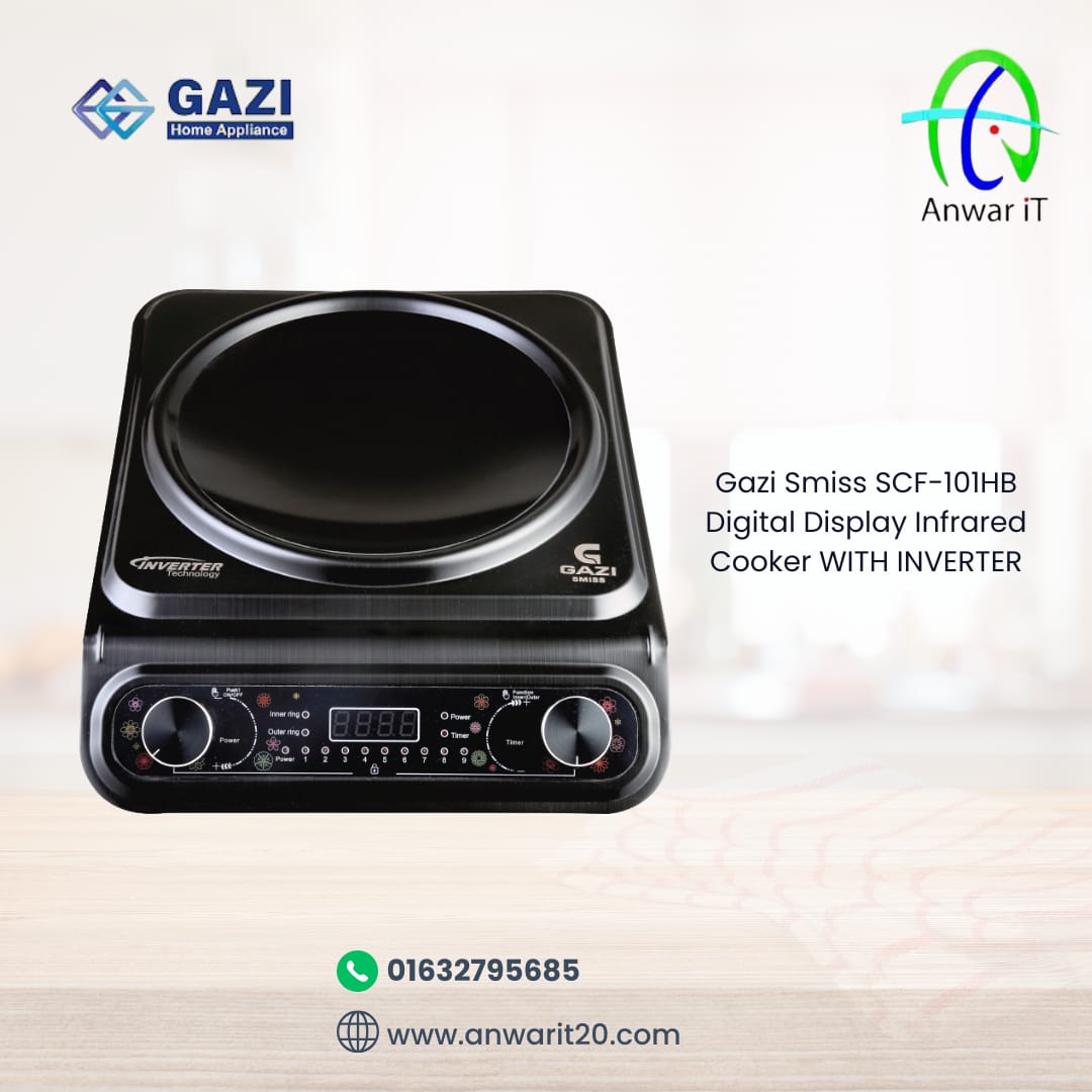 Model: SCF-101HB INFRARED COOKER WITH INVERTER Advance Cooling System Triple Insulation Layer Works with any types of cooking pots Inverter Technology Multiple cooking functions Multiple Power Modes Digital Display Maximum power 2200W Easy to use About Gazi: Founded in 1972, Gazi Group is one of Bangladesh’s most trusted business groups with over 40 years of excellence across Manufacturing, Trading, ICT, Real Estate, Banking, Insurance, and Media. ✔ Durable • ✔ Efficient • ✔ Trusted Brand Disclaimer: Anwar iT একটি অনুমোদিত Gazi Home Appliance ডিলার। আমরা পণ্যের রং ও ডিজাইন যথাসম্ভব সঠিকভাবে উপস্থাপন করি, তবে আলো, ফটোগ্রাফি ও ডিভাইস স্ক্রিন সেটিংসের কারণে বাস্তব পণ্যের সঙ্গে সামান্য ভিন্নতা থাকতে পারে। প্রদর্শিত ছবিসমূহ Gazi Home Appliance-এর অফিসিয়াল ওয়েবসাইট থেকে সংগৃহীত। পণ্য ক্রয়ের মাধ্যমে ক্রেতা বিষয়টি নোটিস: ক্যাশ অন ডেলিভারির ক্ষেত্রে অর্ডার কনফার্ম করতে ১০% অগ্রিম পেমেন্ট (অফেরতযোগ্য) প্রযোজ্য। ⭐ প্রোডাক্ট গ্রহণের আগে ভালোভাবে যাচাই করুন। কোনো স্ক্র্যাচ, ভাঙা বা ত্রুটি থাকলে দয়া করে রিসিভ করবেন না। ⭐ পেমেন্টের পূর্বে সঠিক প্রোডাক্ট নিশ্চিত করা আবশ্যক। ⭐ ডেলিভারি সম্পন্ন হওয়ার পর শুধুমাত্র অফিসিয়াল ওয়ারেন্টি প্রযোজ্য হবে। ⭐ ডেলিভারির পরবর্তী কোনো ফিজিক্যাল ড্যামেজের দায় প্রতিষ্ঠান নেবে না। ⭐ স্টক অবস্থার উপর ভিত্তি করে ডেলিভারির সময় পরিবর্তিত হতে পারে।